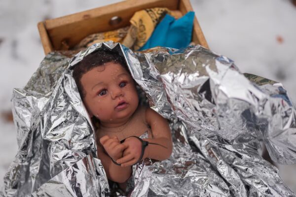 DEDHAM, Mass. — One baby Jesus lays in a manger in the snow, wrapped in a silver emergency blanket with…
