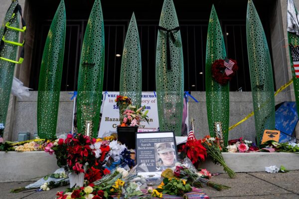 A makeshift memorial for U.S. Army Spc. Sarah Beckstrom and U.S. Air Force Staff Sgt. Andrew Wolfe is seen outside…
