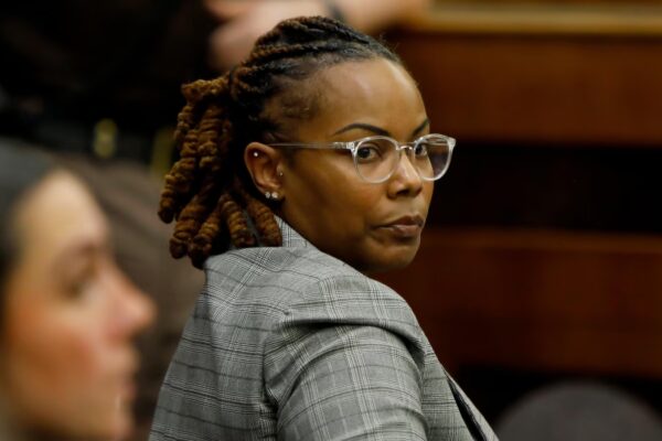 Former Richneck Elementary School assistant principal Ebony Parker looks back into the courtroom during Abby Zwerner’s lawsuit against her Tuesday,…