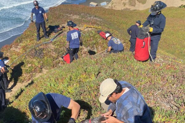 A pet dog fell off an oceanside bluff in San Francisco and spent more than 20 minutes clinging to a…