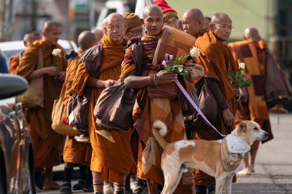 A group of Buddhist monks and their rescue dog are striding single file down country roads and highways across the…