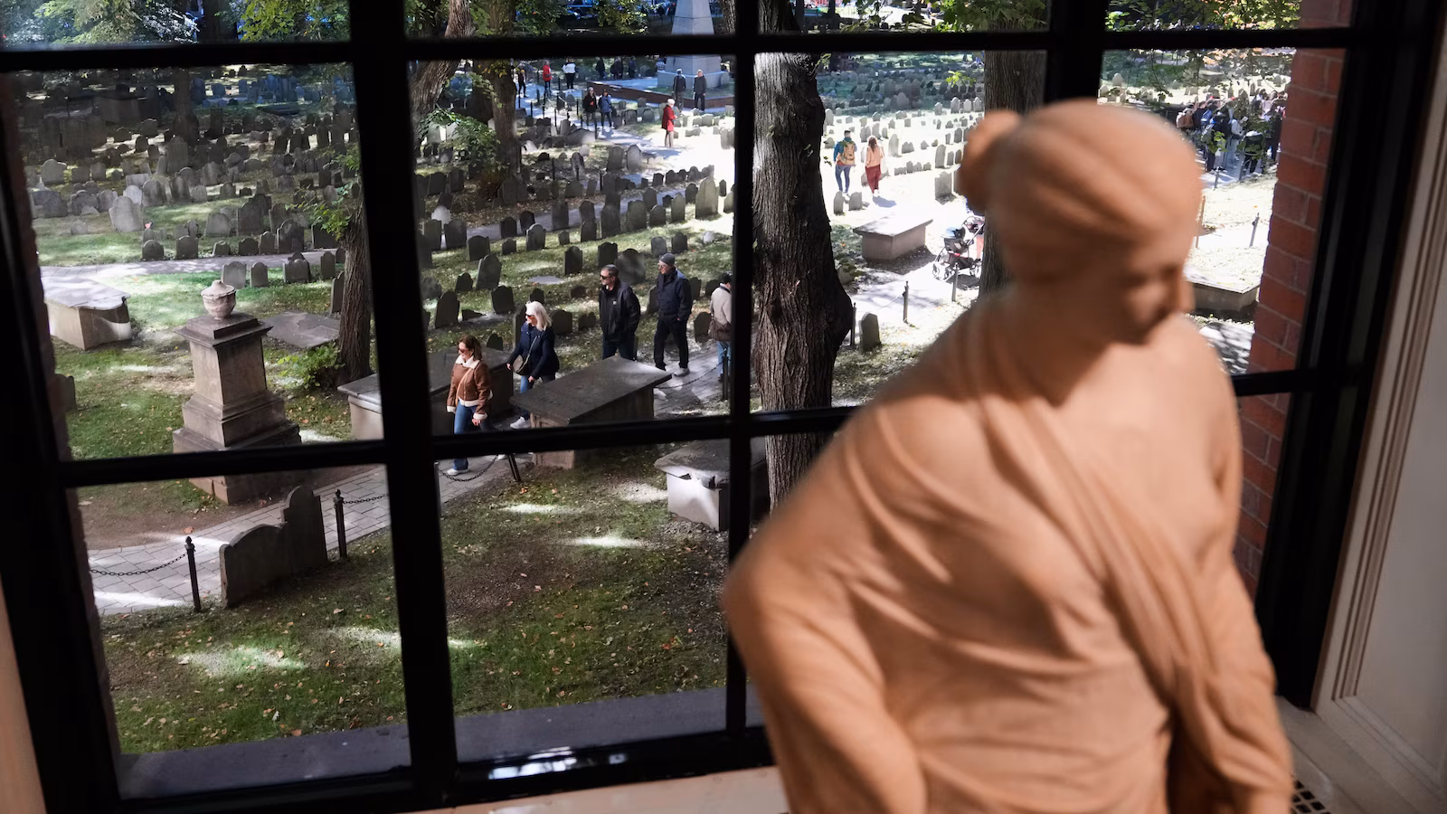Natural light shines in from large windows where guests can look down to see one of Boston’s most historic cemeteries where figures like Paul Revere, Samuel Adams, and John Hancock are buried.
