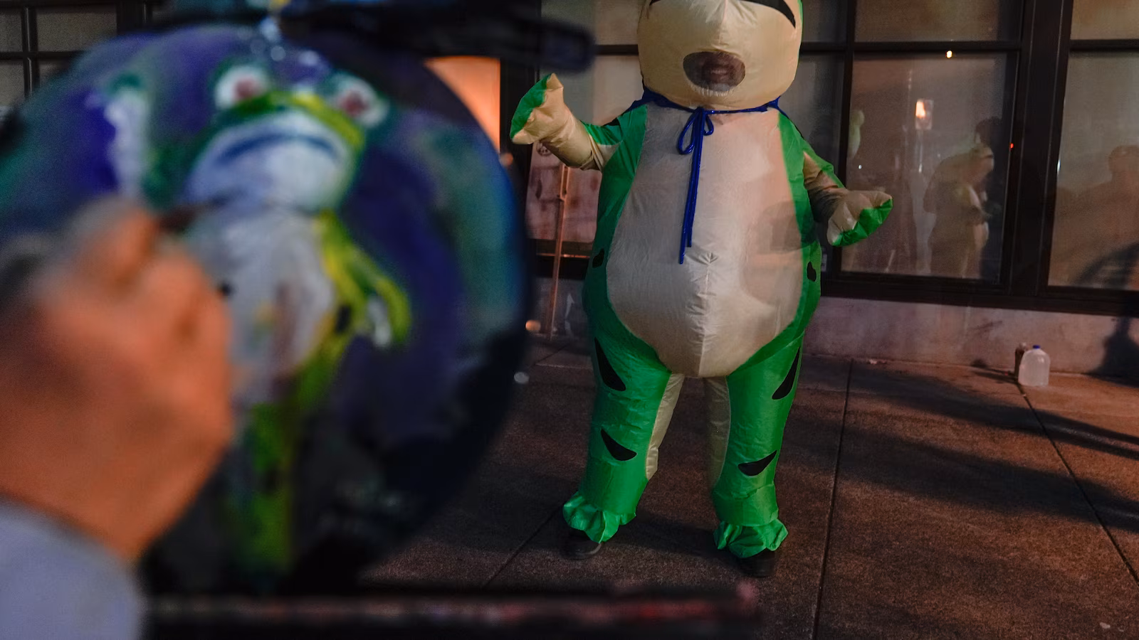Some groups have started giving out the costumes to encourage more demonstrators to wear them. In Austin, Texas, college student Natalie McCabe got a free inflatable bald eagle costume. At the recent No Kings rally, she hung out with a unicorn and a frog.