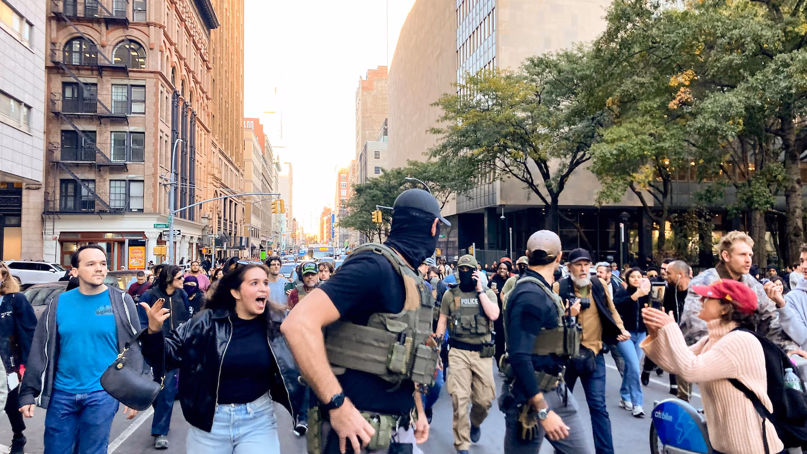 As more New Yorkers joined the fray, some of the federal agents retreated on foot, followed by jeering protesters and honking vehicles. Additional federal agents, armed with long guns and tactical gear, also arrived in a military tactical vehicle.