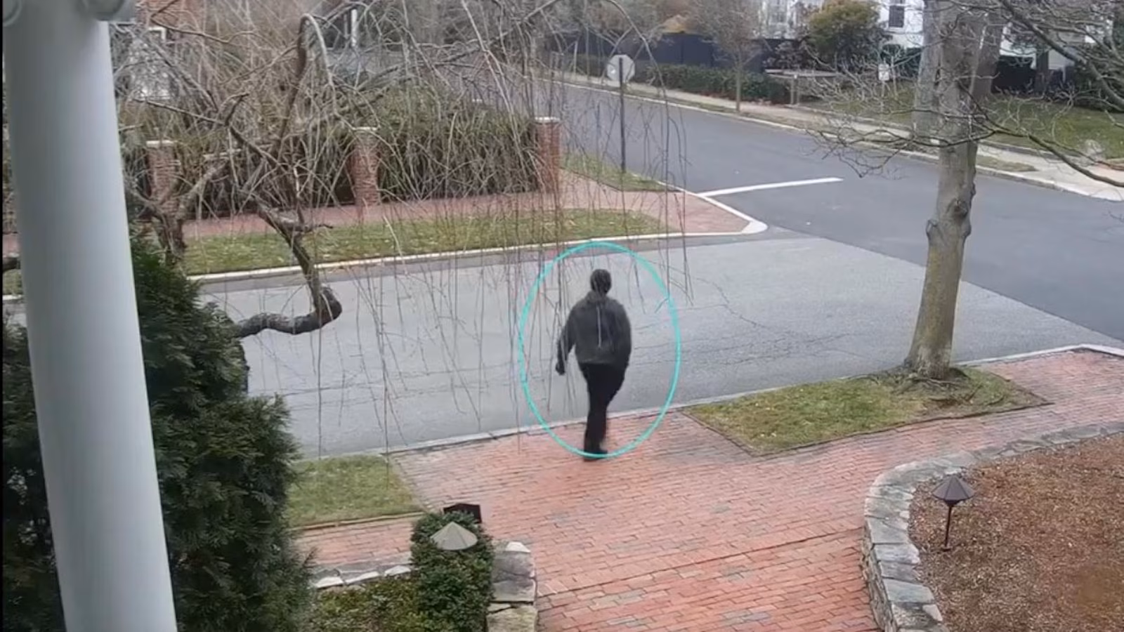 Some clips show the person walking in front of some properties several times. In one, the person abruptly turns around and runs in the other direction when someone approaches.